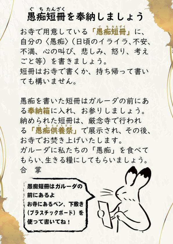 【愚痴短冊を奉納しましょう】 お寺で用意している「愚痴短冊」に、自分の〈愚痴〉(日頃のイライラ、不安、不満、心の叫び、悲しみ、怒り、考えごと等)を書きましょう。